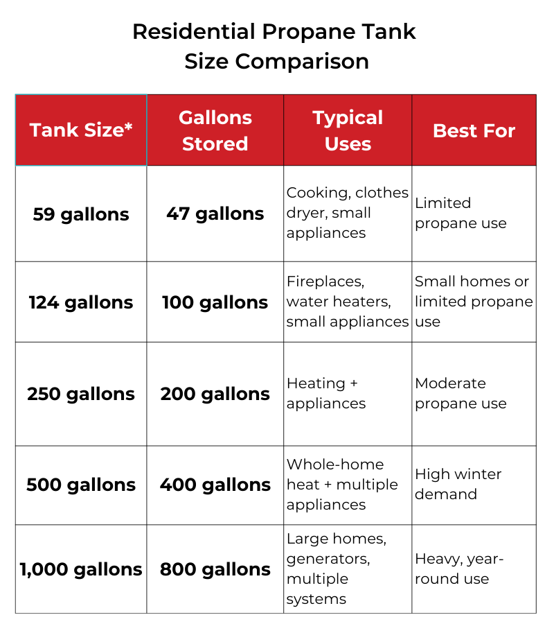 Residential propane tanks typically range in size from 59 to 1,000 gallons, with most homes using a 59-, 124-, 250-, or 500-gallon tank depending on heating needs, appliance usage, and seasonal demand. Choosing the right tank size should be based on your highest-use months so you have enough heating fuel for winter, when propane consumption increases and delivery schedules can be impacted by weather and demand.
